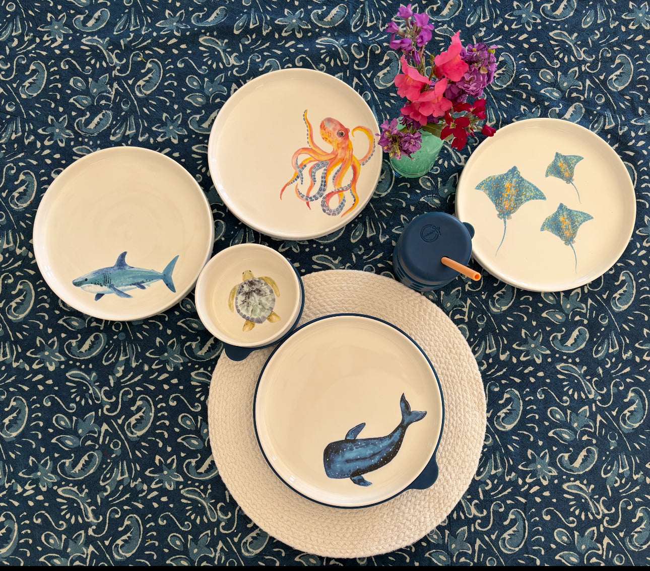 Set Includes: Whale Shark Plate (9"), Turtle Bowl (4"), Cup, plus coordinating silicone base, lid, and straw.